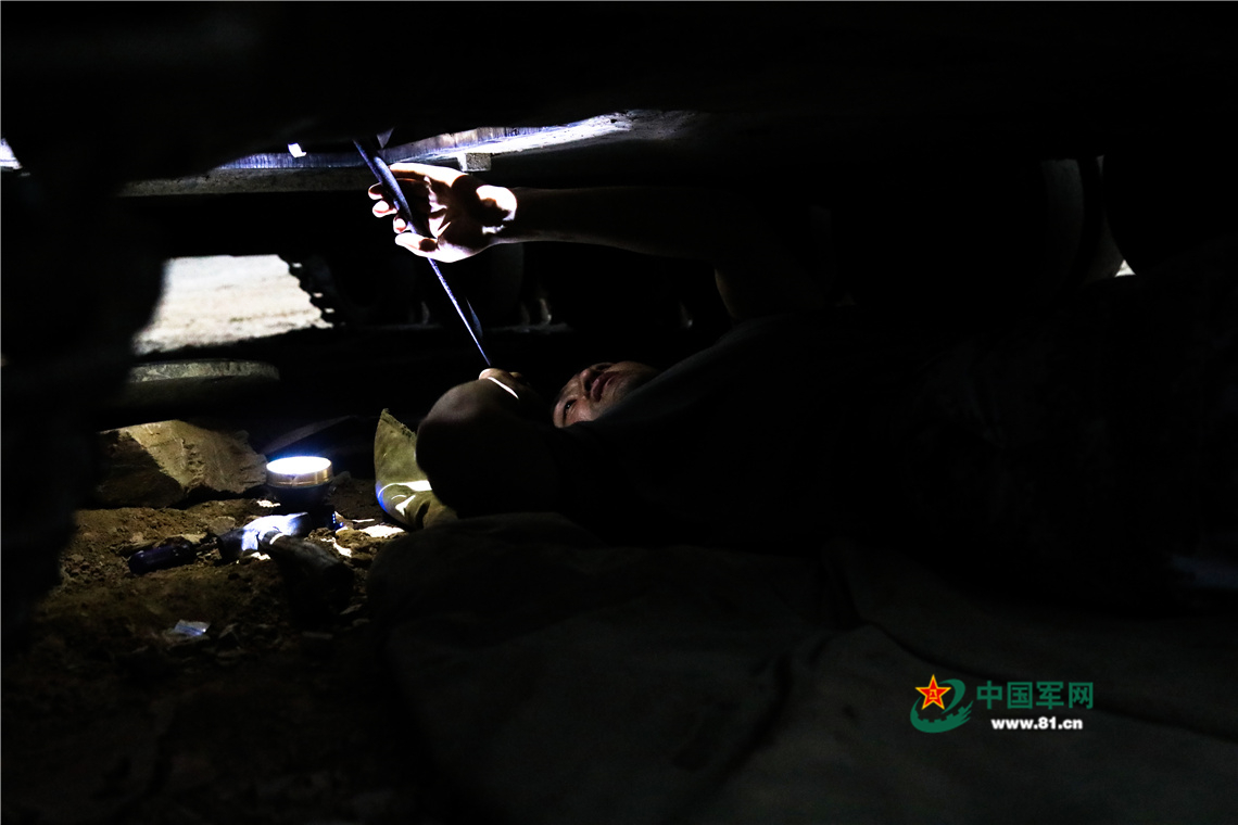 夜间驾驶训练开始前,官兵们正加班加点检修装备