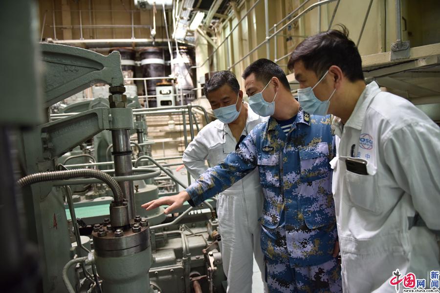 保障组官兵向接舰工作人员传授维护装备的经验。