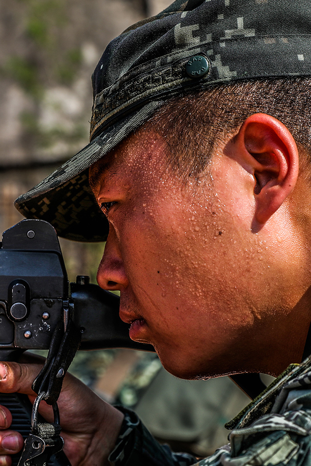 烈日暴晒下官兵汗水直流。