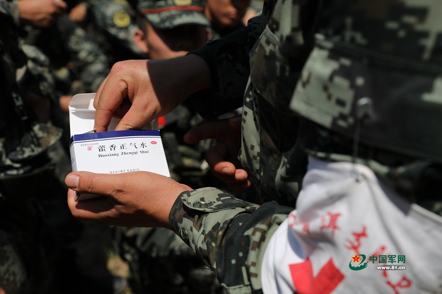 随队卫生员为战士发放防暑药品。