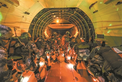 抵达预定空域,官兵准备实施空降。