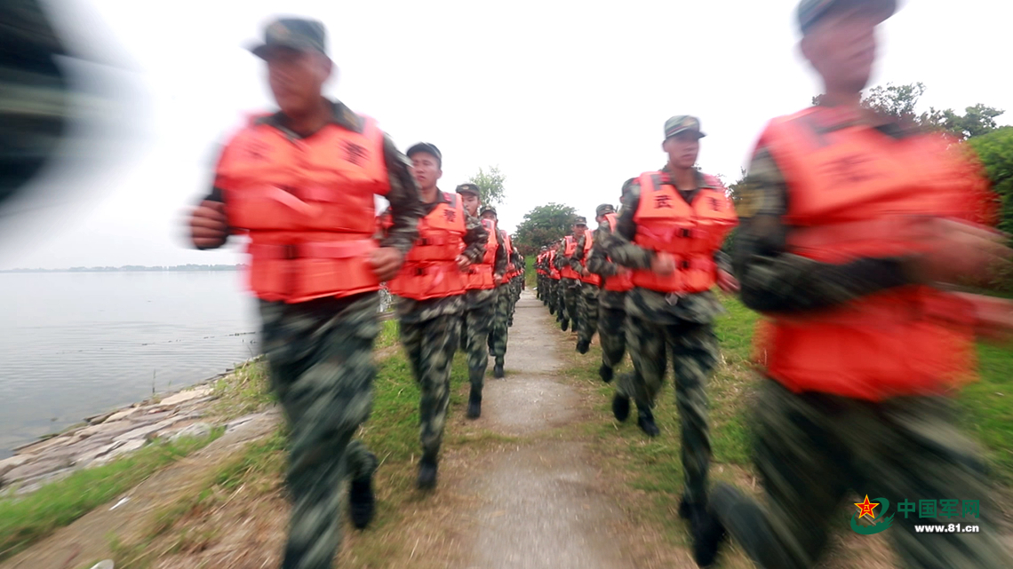 官兵冲向冲锋舟。