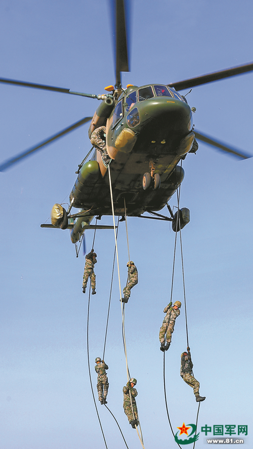 5月12日,第72集团军某陆航旅联合某特战旅进行直升机索降训练。