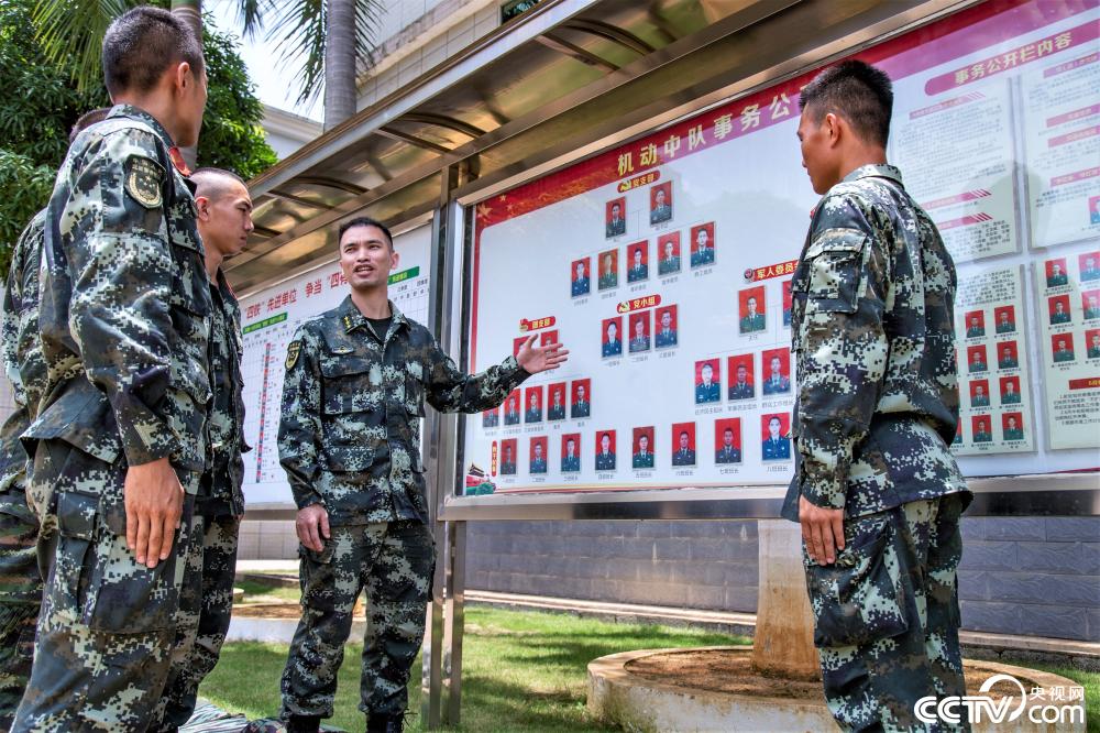 袁木轩(中左)与中队支委探讨基层组织建设工作。(余海洋 摄)
