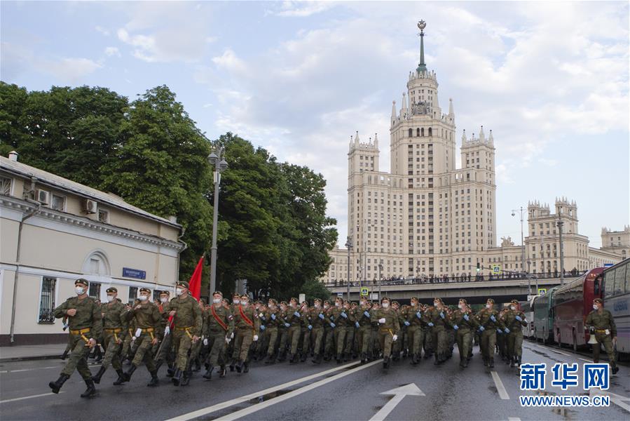 6月18日,步兵方队在俄罗斯首都莫斯科参加阅兵式彩排。 俄罗斯将于6月24日举行纪念卫国战争胜利75周年阅兵式。 新华社发(亚历山大摄)