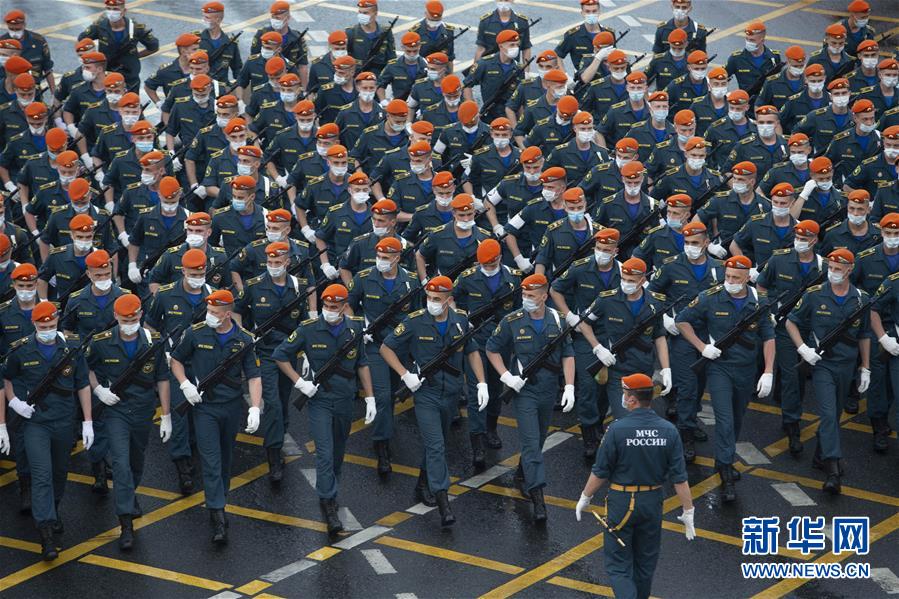 6月18日,步兵方队在俄罗斯首都莫斯科参加阅兵式彩排。 俄罗斯将于6月24日举行纪念卫国战争胜利75周年阅兵式。 新华社发(亚历山大摄)
