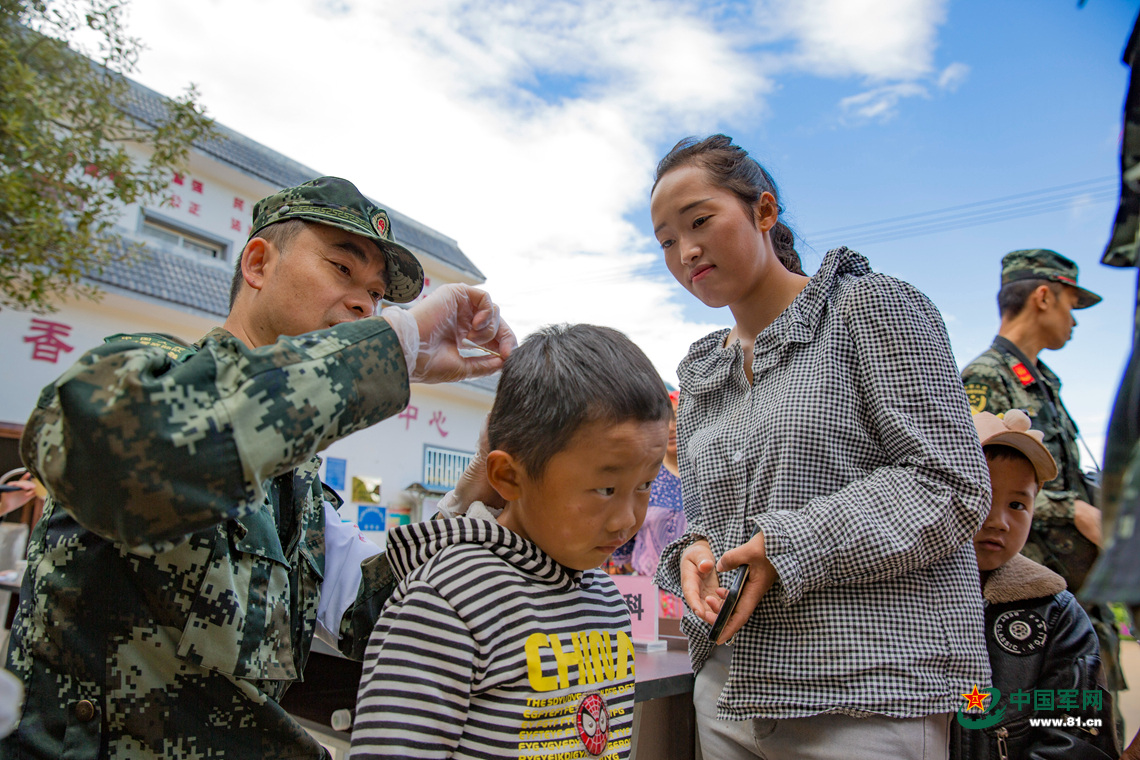 军医在卫生扶贫医疗点为村里小孩进行诊疗。 李义 摄