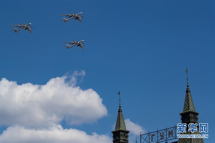6月24日,图-95MS战略轰炸机梯队参加在俄罗斯莫斯科红场举行的阅兵式。 当日,俄罗斯在首都莫斯科隆重举行纪念卫国战争胜利75周年阅兵式。 新华社记者 白雪骐 摄