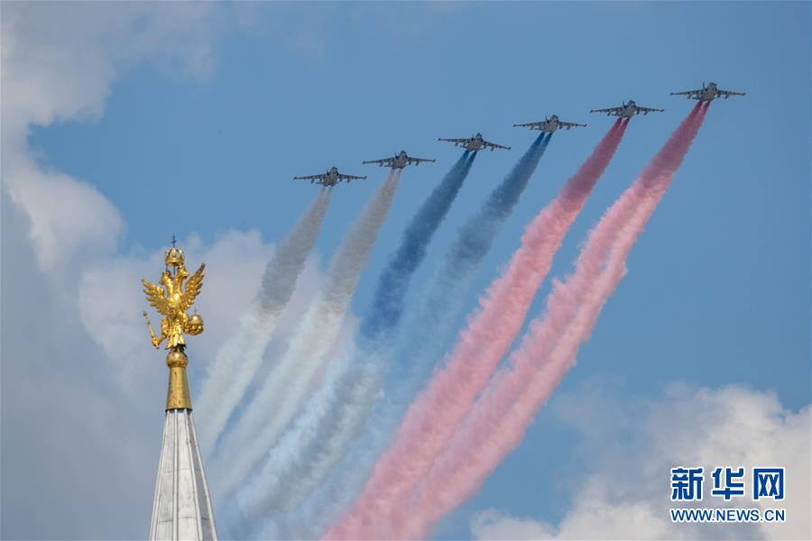 6月24日,苏-25攻击机梯队参加在俄罗斯莫斯科红场举行的阅兵式。 当日,俄罗斯在首都莫斯科隆重举行纪念卫国战争胜利75周年阅兵式。 新华社记者 白雪骐 摄