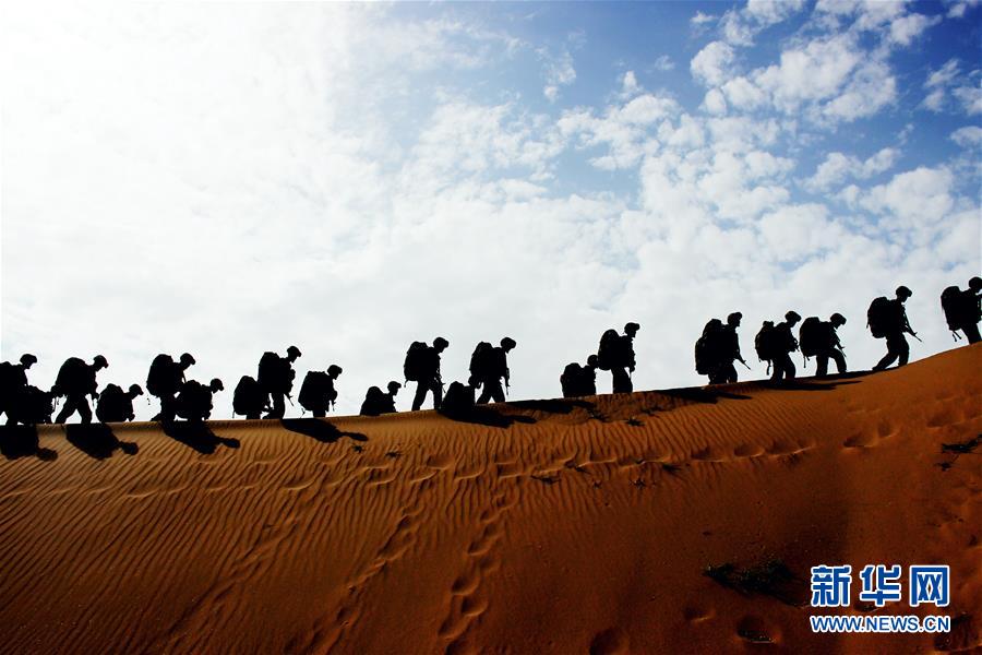 武警新疆总队机动第六支队特战队员在沙漠进行长途奔袭(6月23日摄)。 新华社发(包天星 摄)