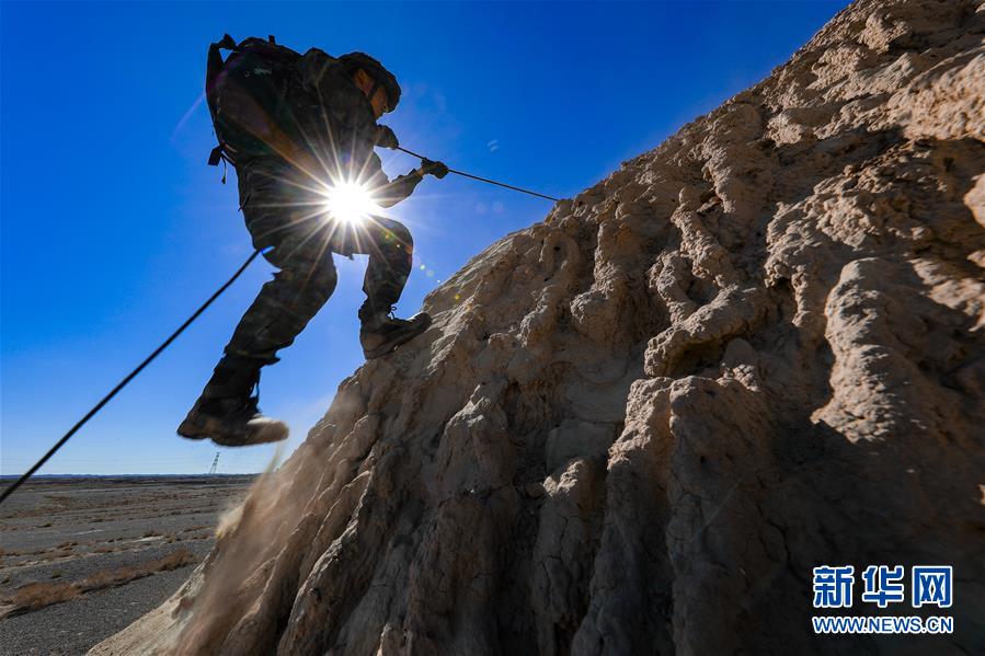 武警新疆总队克拉玛依支队特战队员进行攀岩训练(6月24日摄)。 新华社发(赵俊杰 摄)