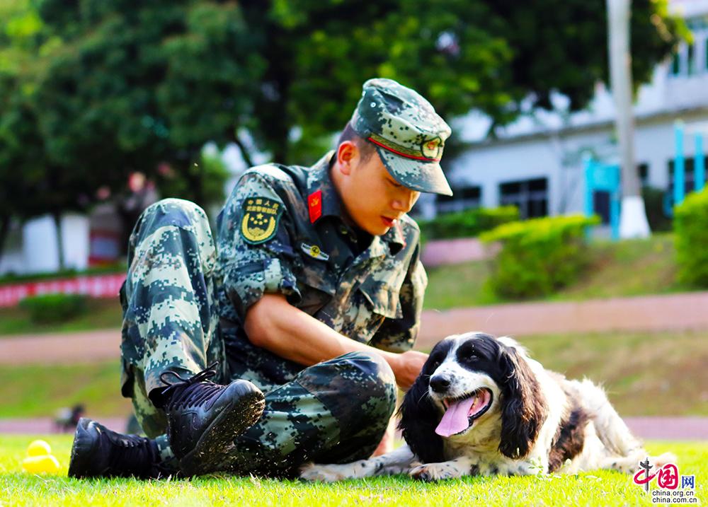 警犬训导员与警犬尔杰坐在草地上小憩。廖键 摄
