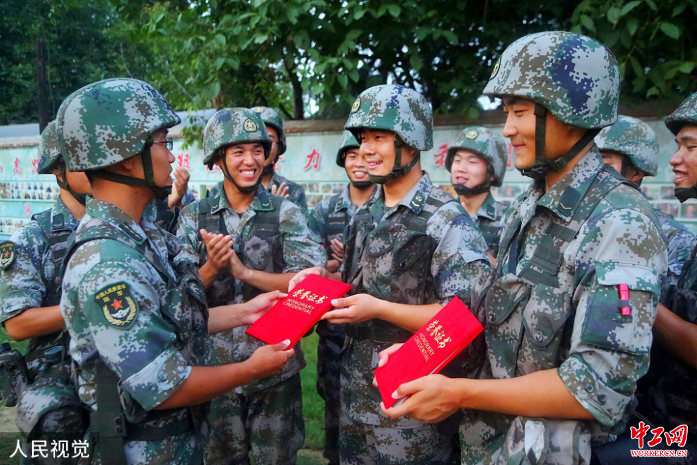 2020年6月25日,河南洛阳,第83集团军某旅舟桥连指导员为优秀共产党员颁发荣誉证书。