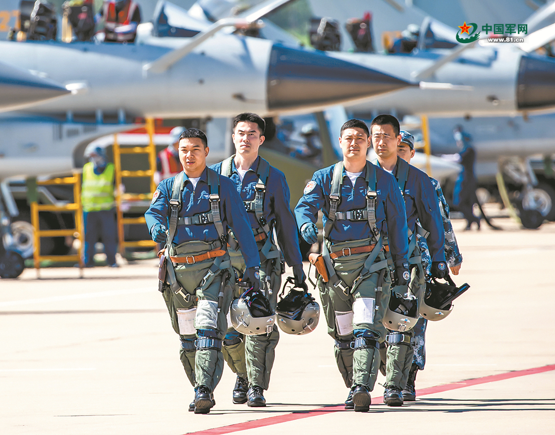 蔡宗君(前左一)和战友们信心满满地走向战机。