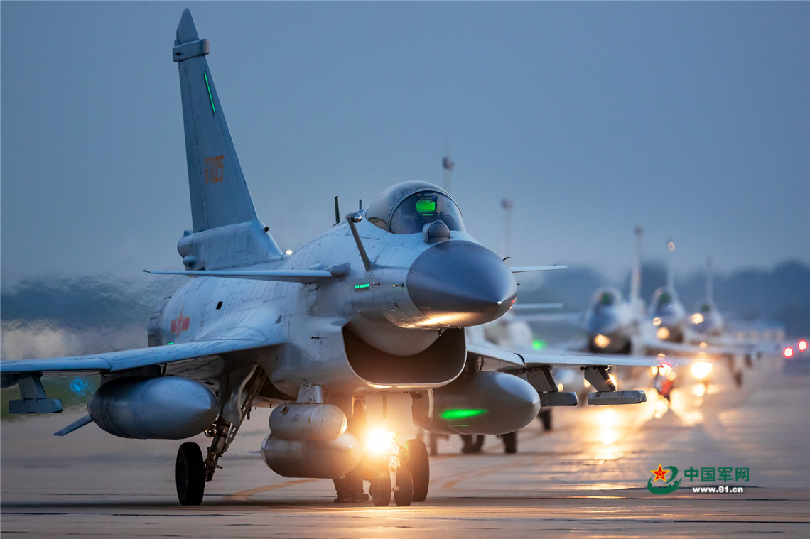 日暮时分,机群滑出准备展开夜间空战训练。杨盼 摄