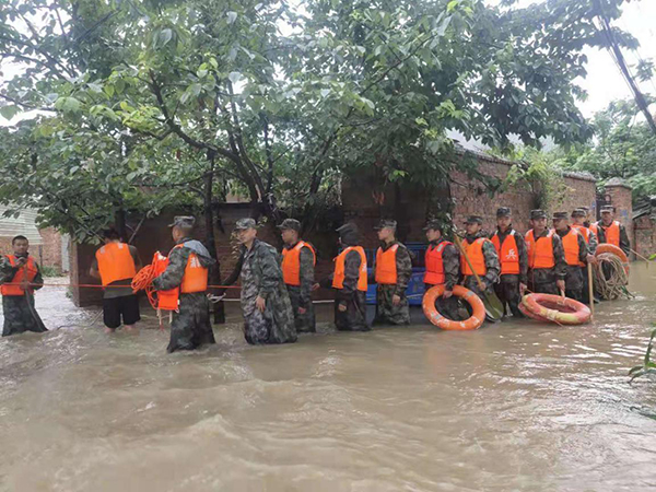 贵州省清镇市人武部出动民兵协助青龙山街道,在中心村疏散受灾被困群众。肖雄 摄