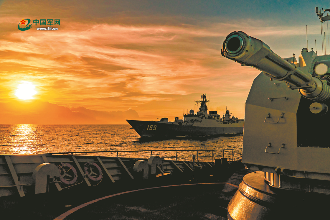 舰艇编队迎着夕阳驶向深蓝。