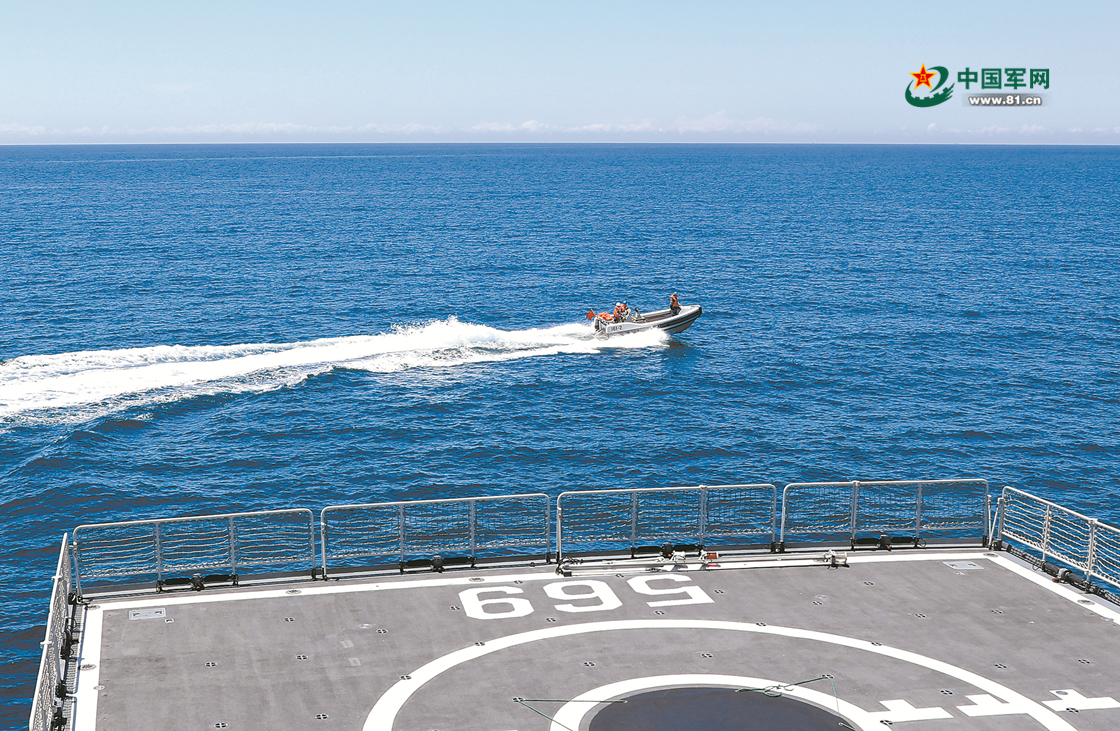 参训舰艇吊放的小艇高速前出,参加反恐反海盗演练。