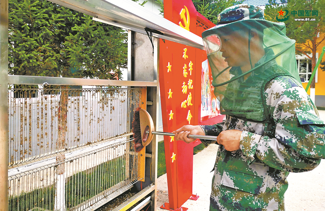 官兵清理营区灭蚊灯上残留的蚊虫。