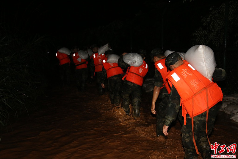 2020年7月8日凌晨,武警景德镇支队官兵在景德镇市珠山区观音阁地区搬运沙袋,加固昌江堤坝。受连续强降雨影响,7月7日晚,江西省景德镇市珠山区观音阁地区昌江发生漫堤险情。武警江西总队景德镇支队迅速出动50名兵力担负加固堤坝任务。截止7月8日凌晨3时35分,共装填搬运沙袋2000余袋,加固堤坝180米,目前险情已排除。人民视觉