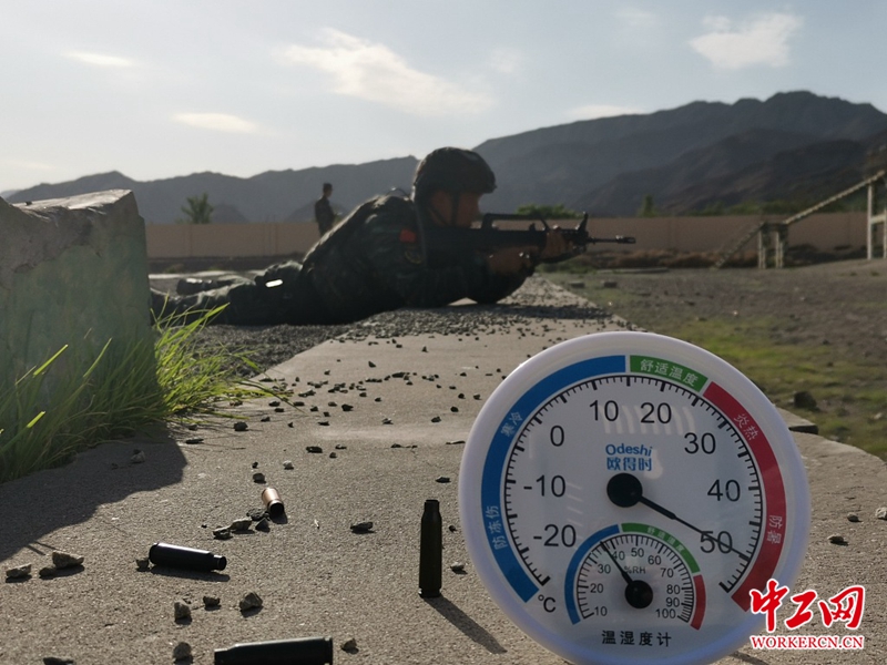 2020年7月7日,宁夏石嘴山,官兵进行实弹射击。近日,石嘴山地区地表温度达到50摄氏度,武警宁夏总队石嘴山支队官兵克服高温天气,着眼任务需要,在某训练场冒着高温酷暑开展“夏练三伏”军事训练活动,全面提升官兵军事素质。作者:罗辉波/人民视觉