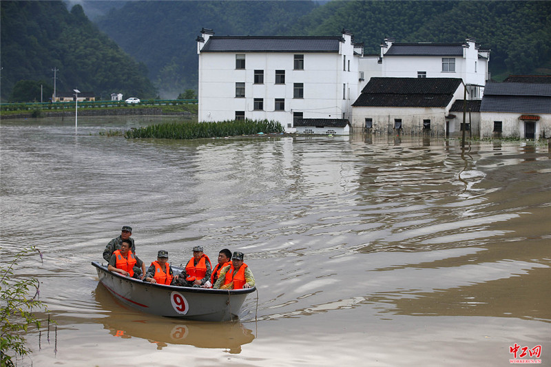 2020年7月6日,在安徽省黄山市黄山区三口镇白果树村,救援人员在紧急转移被困群众。施亚磊/人民视觉