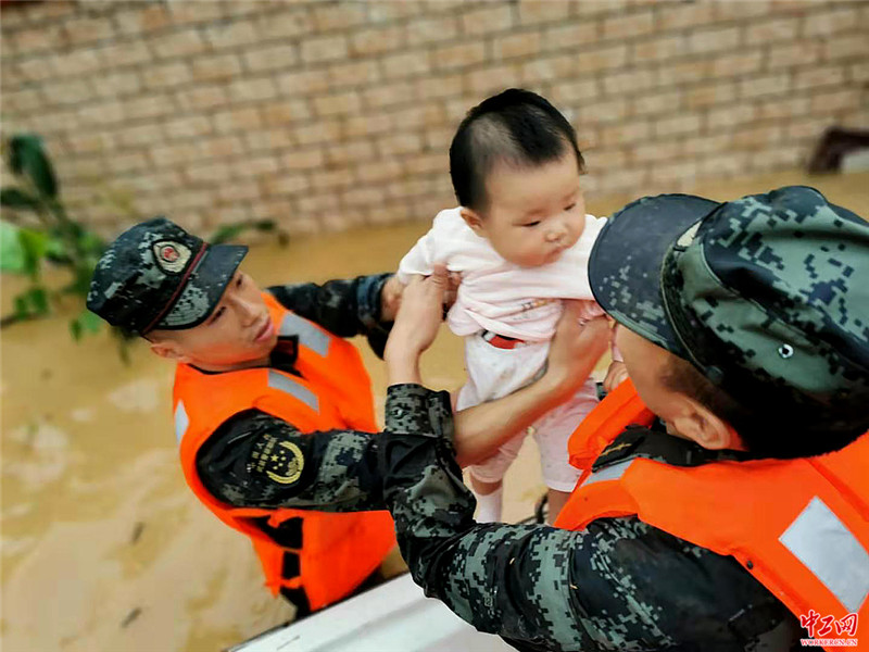2020年6月8日,广东清远,在源潭镇莲安村,武警官兵在转移被困群众。廖键/人民视觉
