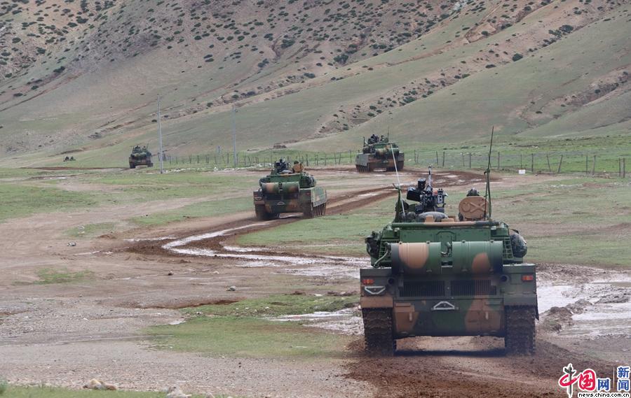 中国网军事7月13日讯 高原深处,寒风呼啸,铁流滚滚。近日,西藏军区某旅在海拔4700高寒山地冰雪条件下快速机动演练。随着该旅旅长陈光一声令下,某轻型装甲战车,轰鸣着向预定区域开始机动。