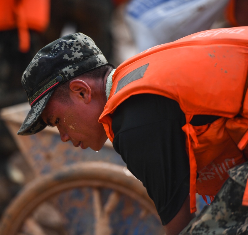 7月13日,武警江西总队机动支队防化中队战士朱仁鹏在圩堤旁装填沙袋。新华社记者 胡晨欢 摄