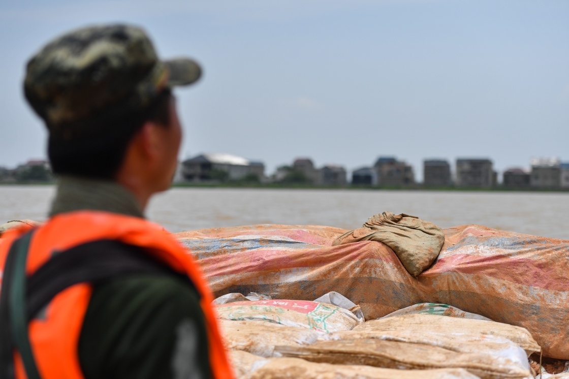 7月13日,武警江西总队机动支队防化中队战士杨泽宇在观察昌江的水位。新华社记者 胡晨欢 摄