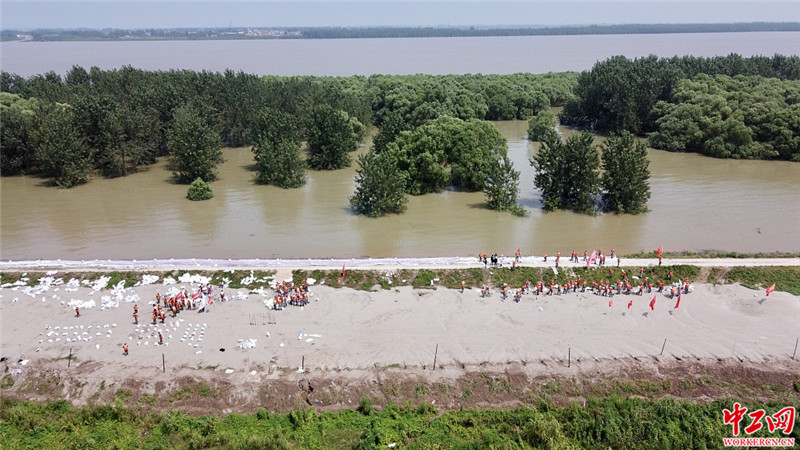 2020年7月14日,江西九江,柴桑区江洲镇,驰援官兵正在装填沙袋加高江洲镇长江北堤蔡洲村责任段子堤。自7月11日紧急驰援江洲镇以来,空军某部驻浔部队百余名官兵连续作战,每天奋战14至15小时,累积装填、堆垒沙袋5万余袋,加固、加高长江北堤蔡洲村责任段子堤。刘家/人民视觉