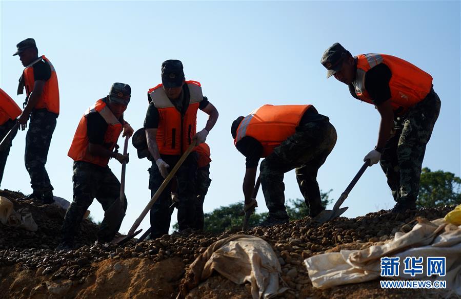 武警江西总队上饶支队的官兵在处置一处堤坝坍塌险情(7月14日摄)。 开挖导渗沟、填埋沙石、疏通排水渠、垒填沙袋,汗水划过脸颊,浸湿军装。在位于江西省余干县古埠镇的齐埠联圩上,武警江西总队上饶支队的60名战士头顶烈日,挥汗如雨,在泥水中处置一处堤坝坍塌险情。在这群平均年龄只有21岁的年轻战士中,最小的只有18岁,其中“00”后战士就有27人。在汗水与泥水的交织中,记者用镜头记录下这些最可爱的身影。 新华社记者 万象 摄