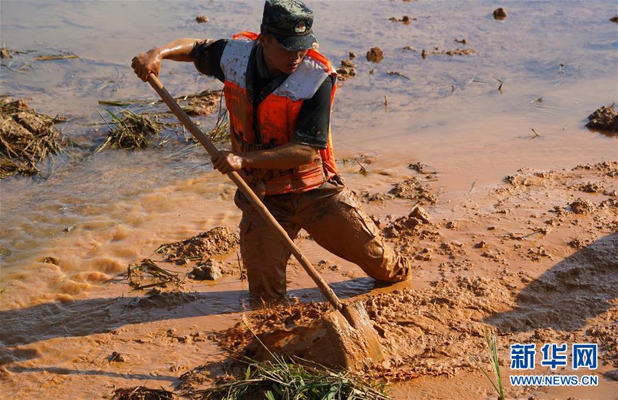 武警江西总队上饶支队的战士在泥水中开挖导渗沟(7月14日摄)。 开挖导渗沟、填埋沙石、疏通排水渠、垒填沙袋,汗水划过脸颊,浸湿军装。在位于江西省余干县古埠镇的齐埠联圩上,武警江西总队上饶支队的60名战士头顶烈日,挥汗如雨,在泥水中处置一处堤坝坍塌险情。在这群平均年龄只有21岁的年轻战士中,最小的只有18岁,其中“00”后战士就有27人。在汗水与泥水的交织中,记者用镜头记录下这些最可爱的身影。 新华社记者 万象 摄