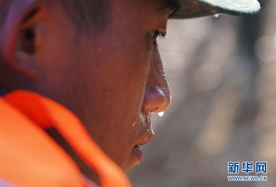 武警江西总队上饶支队的一名战士脸上流下的汗水(7月14日摄)。 开挖导渗沟、填埋沙石、疏通排水渠、垒填沙袋,汗水划过脸颊,浸湿军装。在位于江西省余干县古埠镇的齐埠联圩上,武警江西总队上饶支队的60名战士头顶烈日,挥汗如雨,在泥水中处置一处堤坝坍塌险情。在这群平均年龄只有21岁的年轻战士中,最小的只有18岁,其中“00”后战士就有27人。在汗水与泥水的交织中,记者用镜头记录下这些最可爱的身影。 新华社记者 万象 摄