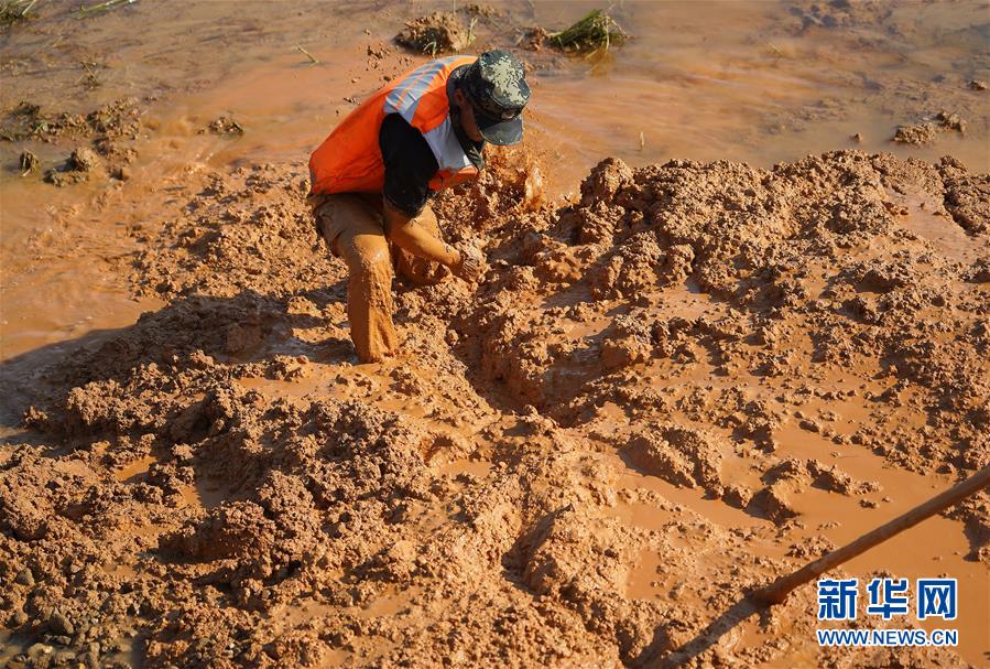 武警江西总队上饶支队的战士在泥水中开挖导渗沟(7月14日摄)。 开挖导渗沟、填埋沙石、疏通排水渠、垒填沙袋,汗水划过脸颊,浸湿军装。在位于江西省余干县古埠镇的齐埠联圩上,武警江西总队上饶支队的60名战士头顶烈日,挥汗如雨,在泥水中处置一处堤坝坍塌险情。在这群平均年龄只有21岁的年轻战士中,最小的只有18岁,其中“00”后战士就有27人。在汗水与泥水的交织中,记者用镜头记录下这些最可爱的身影。 新华社记者 万象 摄