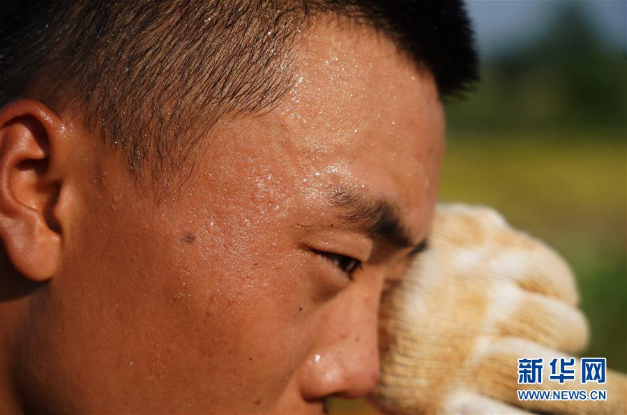 武警江西总队上饶支队的一名战士在擦拭脸上的汗水(7月14日摄)。 开挖导渗沟、填埋沙石、疏通排水渠、垒填沙袋,汗水划过脸颊,浸湿军装。在位于江西省余干县古埠镇的齐埠联圩上,武警江西总队上饶支队的60名战士头顶烈日,挥汗如雨,在泥水中处置一处堤坝坍塌险情。在这群平均年龄只有21岁的年轻战士中,最小的只有18岁,其中“00”后战士就有27人。在汗水与泥水的交织中,记者用镜头记录下这些最可爱的身影。 新华社记者 万象 摄