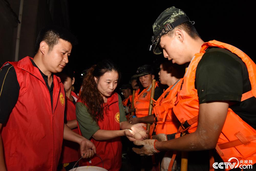 当地志愿者自发组织带着煮鸡蛋、矿泉水等慰问抗洪官兵,堤坝上再现军民鱼水情深。