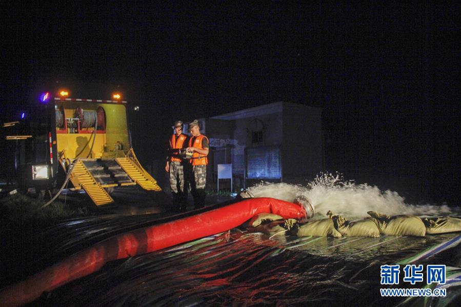 7月13日,在湖北省石首市沙滩子故道,武警第二机动总队某支队官兵利用大型龙吸水装备连夜进行排涝作业。 新华社发(岳小东 摄)