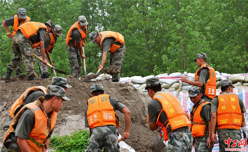 2020年7月15日,东部战区陆军某舟桥旅官兵在江西九江庐山市南康堤抗洪抢险。当天,中国国家卫星气象中心主任杨军对外表示,据卫星遥感监测,中国最大淡水湖——江西鄱阳湖面积进一步扩大。7月14日06时,鄱阳湖主体及附近水域面积达4403平方公里,较历史同期平均值(3510平方公里)偏大25%。五大支流入湖口湿地、鄱阳县昌江和潼津河、千秋河区圩堤决口导致耕地和村庄大面积被淹。人民视觉