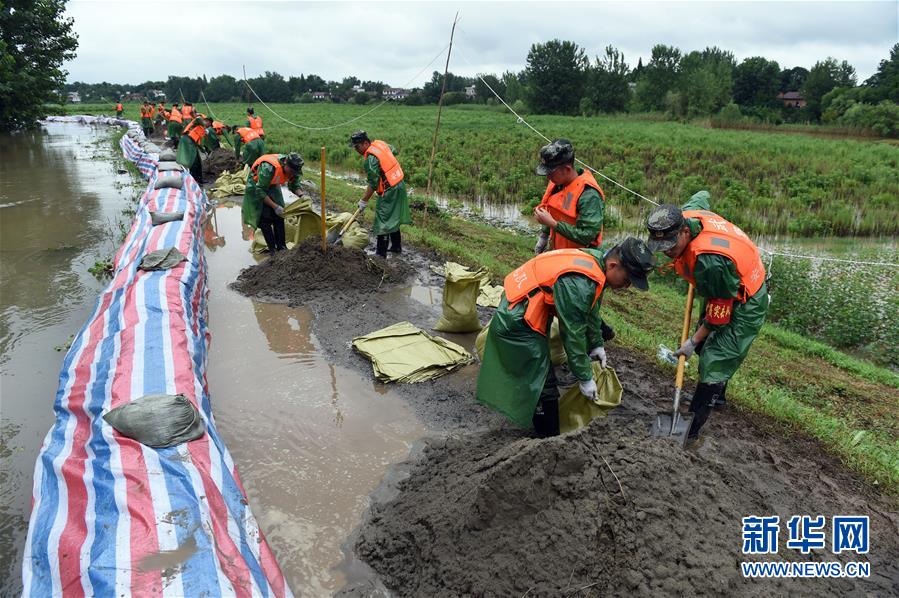 7月16日,在安徽无为长江大堤外护圩三垄圩段,武警安徽总队芜湖支队的官兵在装填沙袋,准备加固子埂。 受连日强降雨影响,安徽省芜湖市鸠江区白茆镇的三垄圩部分圩堤沙土流失,先期加固的子埂出现松动。接到险情后,武警安徽总队芜湖支队立即出动120名官兵展开抢险,加固子埂,保障无为长江大堤安全。 新华社记者 周牧 摄