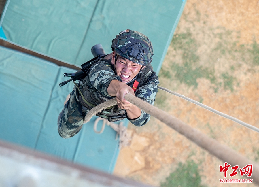2020年7月21日,广西崇左,武警广西总队预备特战队员正在进行抓绳攀登训练。