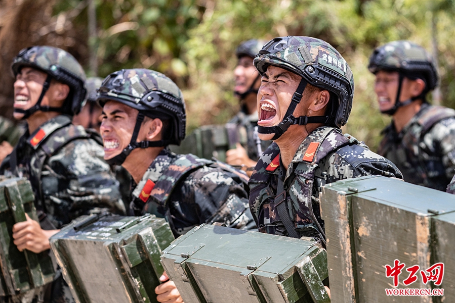 2020年7月21日,广西崇左,武警广西总队预备特战队员正在进行推举弹药箱训练。