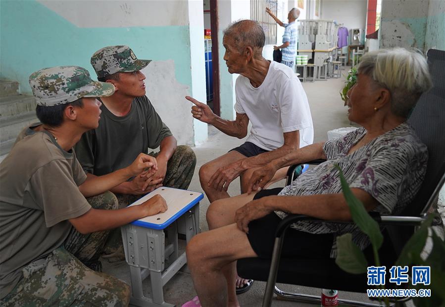 在江西鄱阳县三庙前一中安置点,退伍老兵原鹏帅(左二)和刘厚超(左一)与老人们交流(7月18日摄)。新华社记者 万象 摄