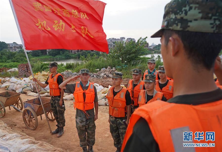 在江西鄱阳县昌江圩堤上,退伍老兵原鹏帅(左二)向武警江西总队的抗洪部队汇报工作(7月18日摄)。新华社记者 万象 摄