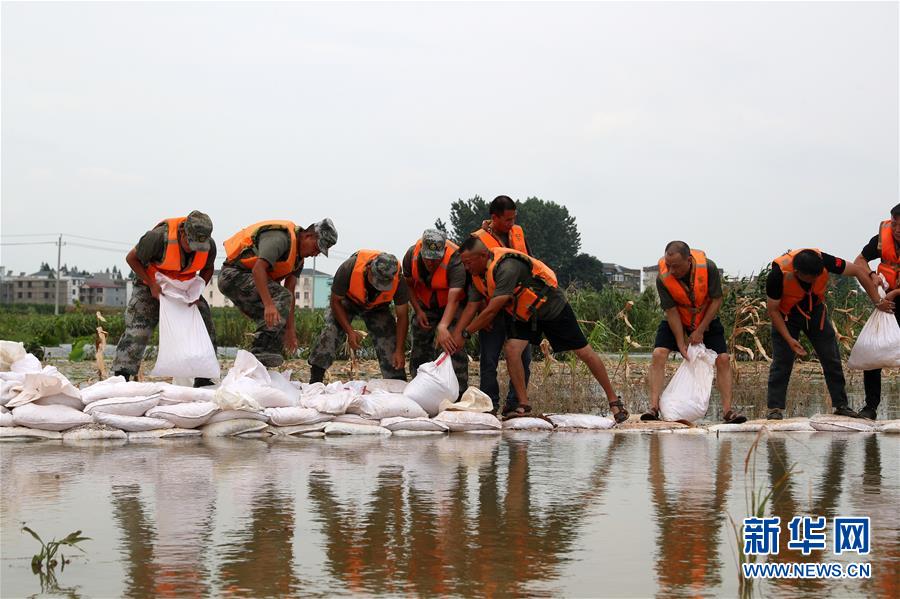 7月19日,火箭军某基地官兵在江西省鄱阳县油墩街镇西河东联圩用防浪布加固堤坝。新华社发(刘明松 摄)