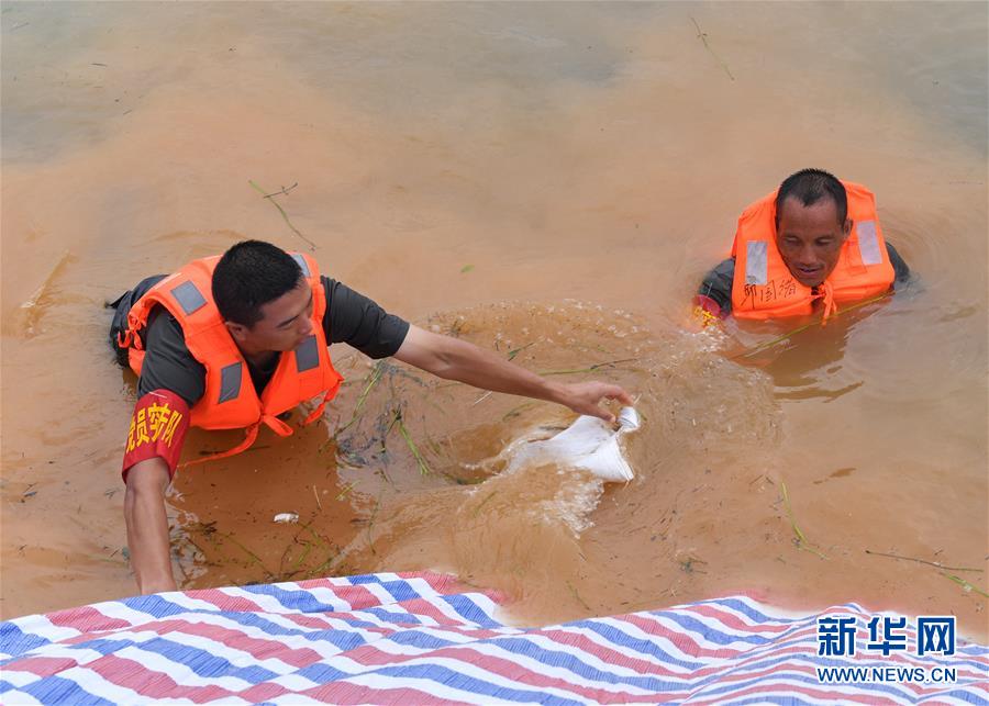 7月19日,在江西省鄱阳县油墩街镇西河东联圩堤坝上,火箭军某基地党员突击队队员置身湖水中,将沙袋沉入坝底。新华社发(刘明松 摄)