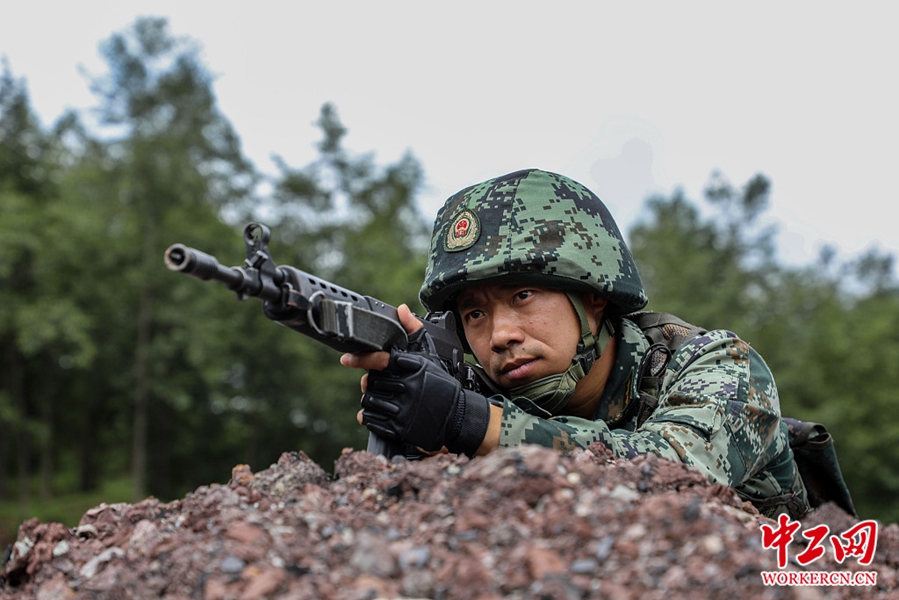 2020年7月22日,在四川省凉山州昭觉县某废弃砖厂内,武警凉山支队昭觉中队指导员张亚舟正在等待一枪毙“敌”。