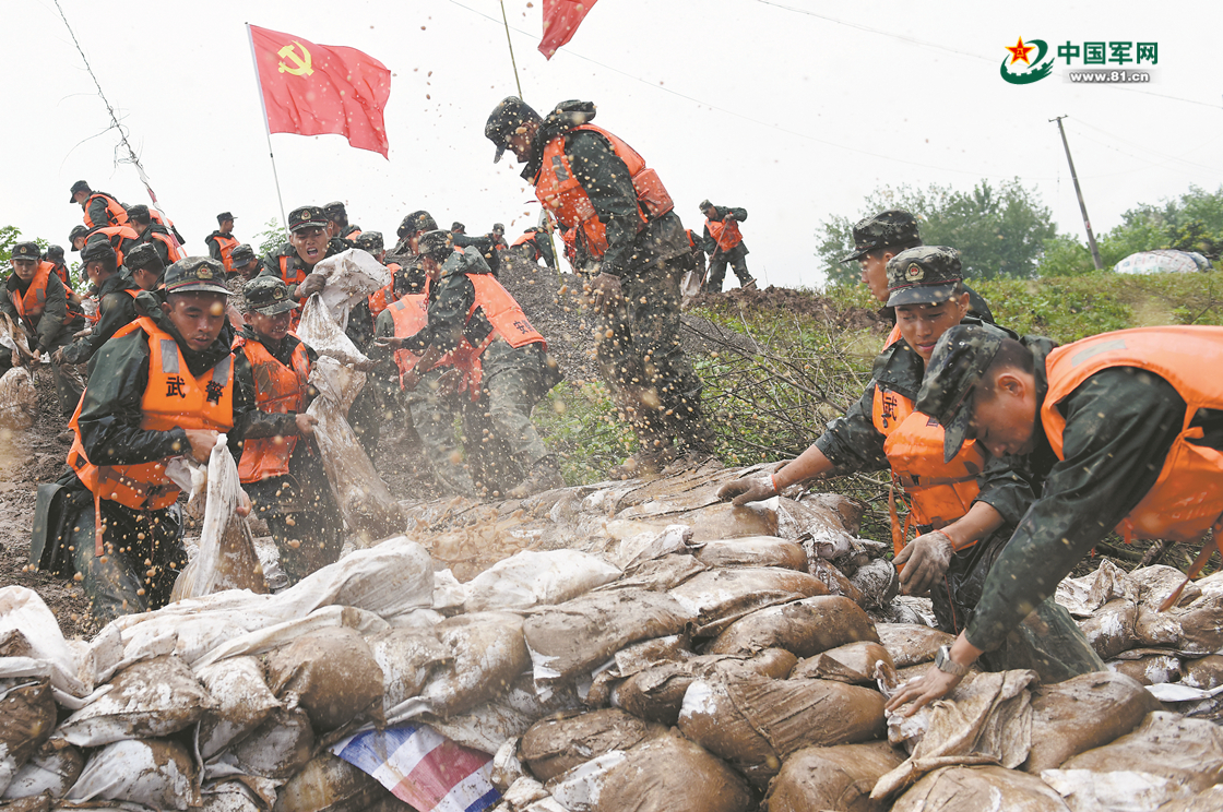 7月16日,长江安徽铜陵段胥坝乡江心洲安平圩出现跌窝,武警合肥支队党员突击队紧急驰援,经过8个小时紧张战斗,成功排除险情。解放军报特约记者徐 伟摄