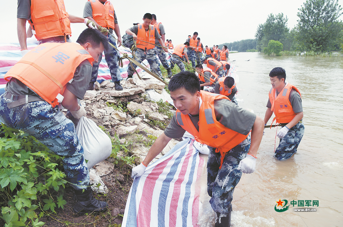 7月19日,空军航空兵某师官兵在对九江江洲镇堤坝进行防浪处理,确保大堤安全。余红春摄