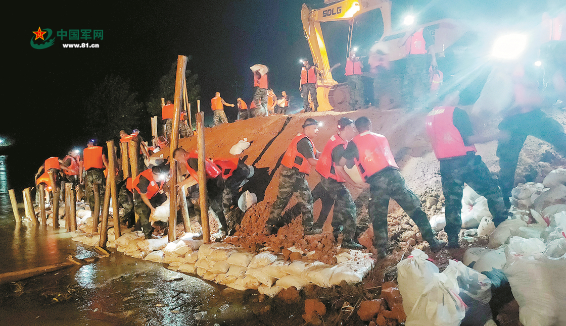 7月18日18时许,接到上级命令,中部战区陆军某舟桥旅,紧急出动120余名官兵,赶赴黄梅县濯港镇丁字街村考田河堤执行处置管涌任务。经过2个多小时紧张作业,险情被有效控制。彭琦骁摄